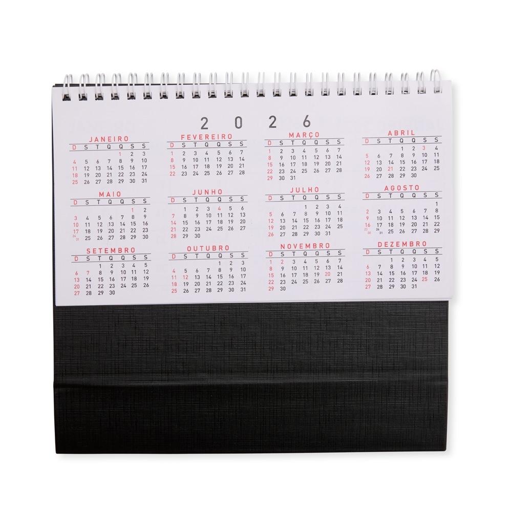 Calendário de mesa 2026 em papel couche 115g, base em percalux.