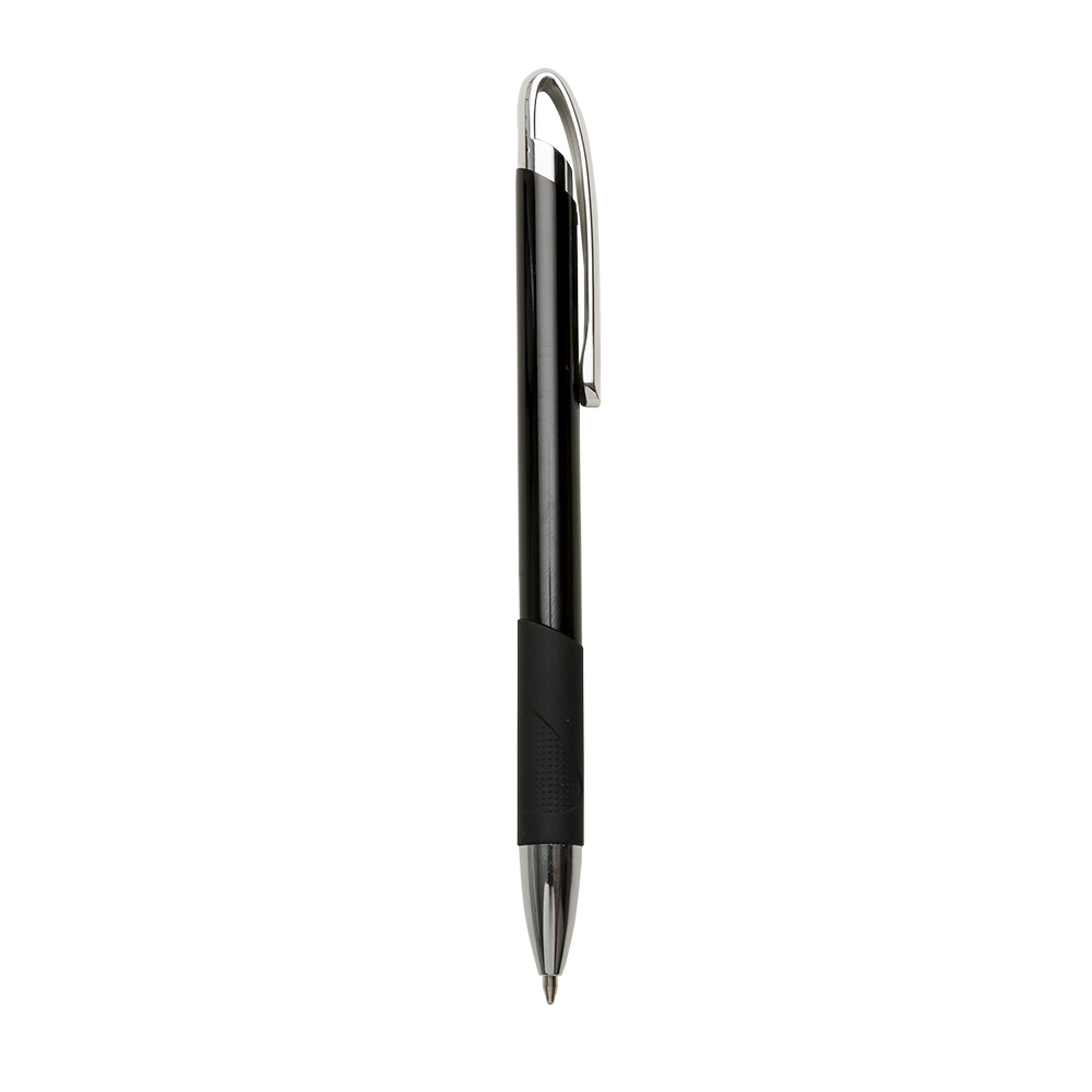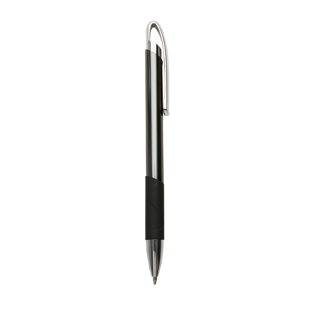 Caneta metálica com detalhe emborrachado, carga esferográfica azul e acionamento por clique.