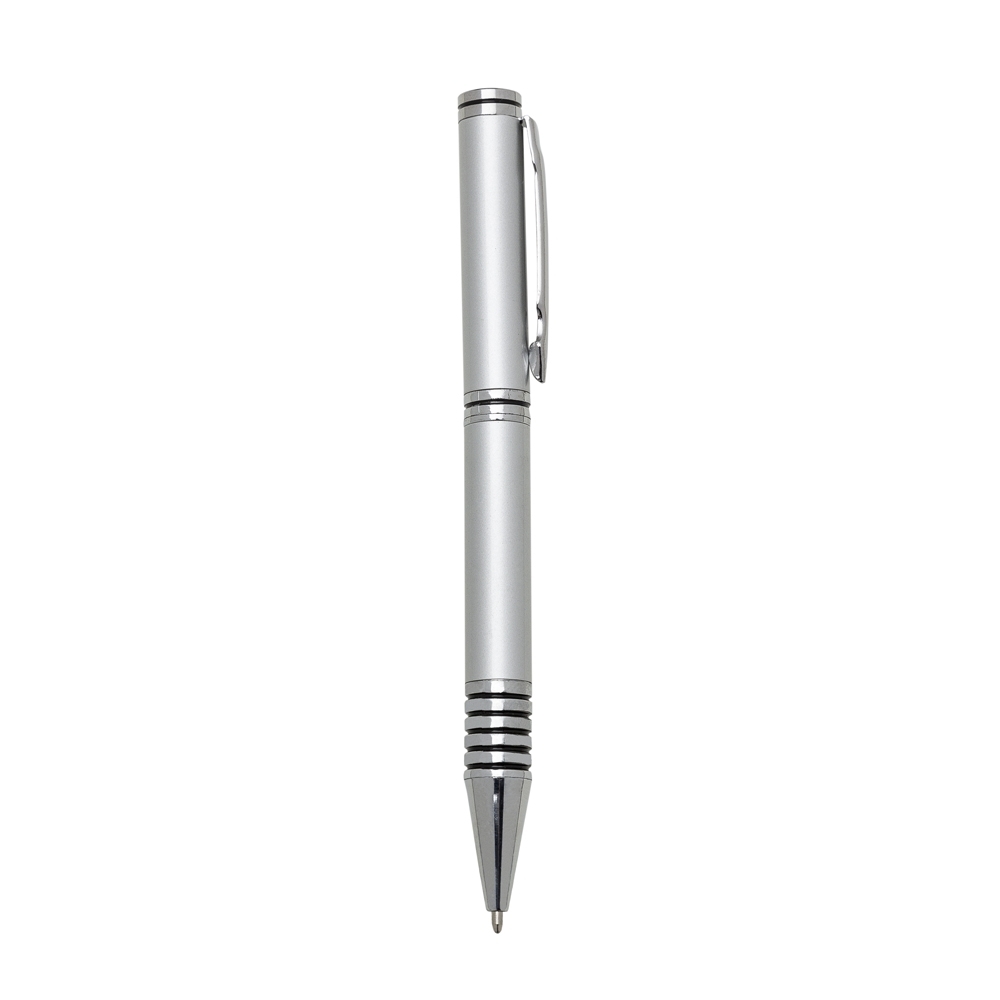 Caneta metálica com carga esferográfica azul e acionamento por rotação.