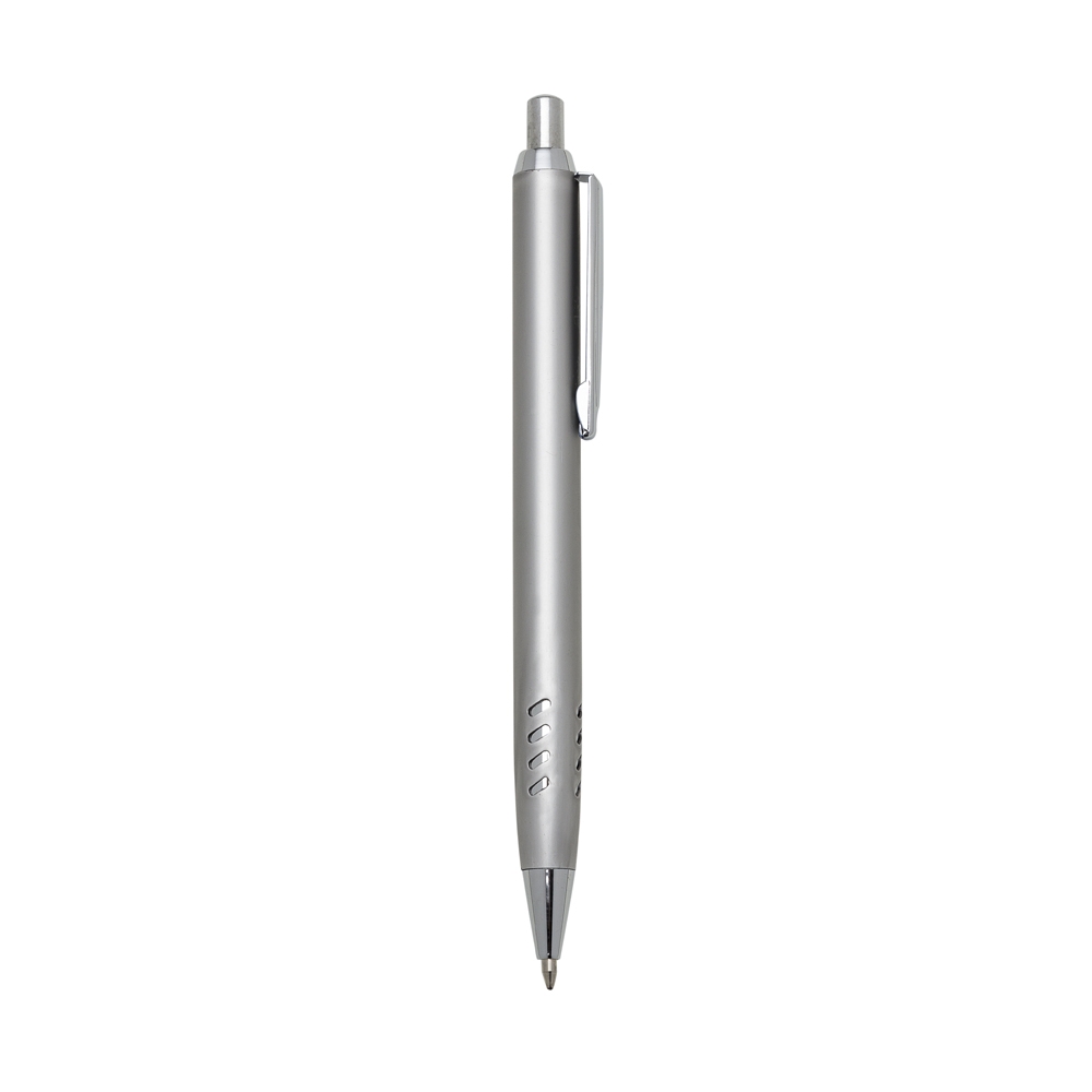 Caneta metálica com carga esferográfica azul e acionamento por clique.