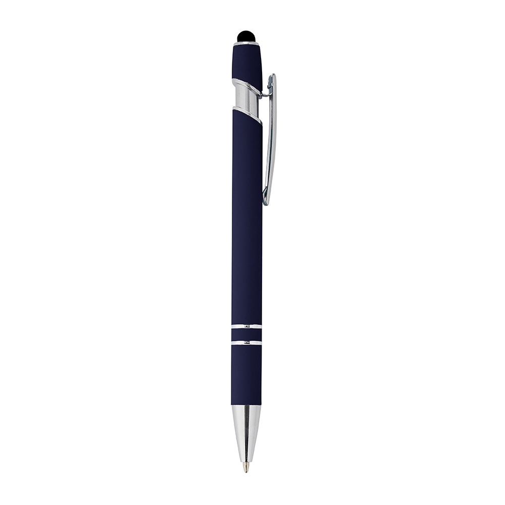 Caneta metálica touchscreen com acabamento similar à borracha, acionamento por clique e carga esferográfica azul 1.0mm.