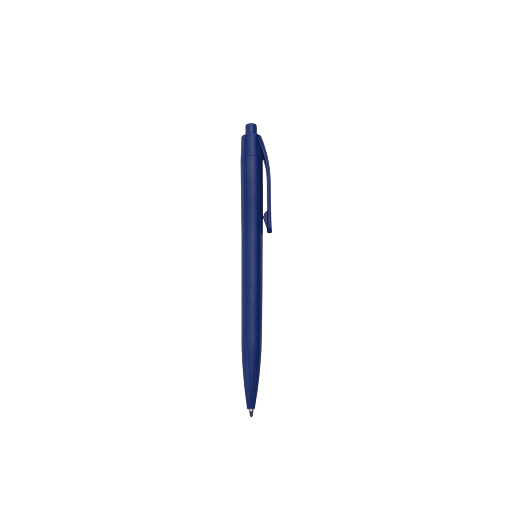 Caneta feita inteiramente em plástico. Conta com acionamento em por clique e carga esferográfica azul de 1.0mm.