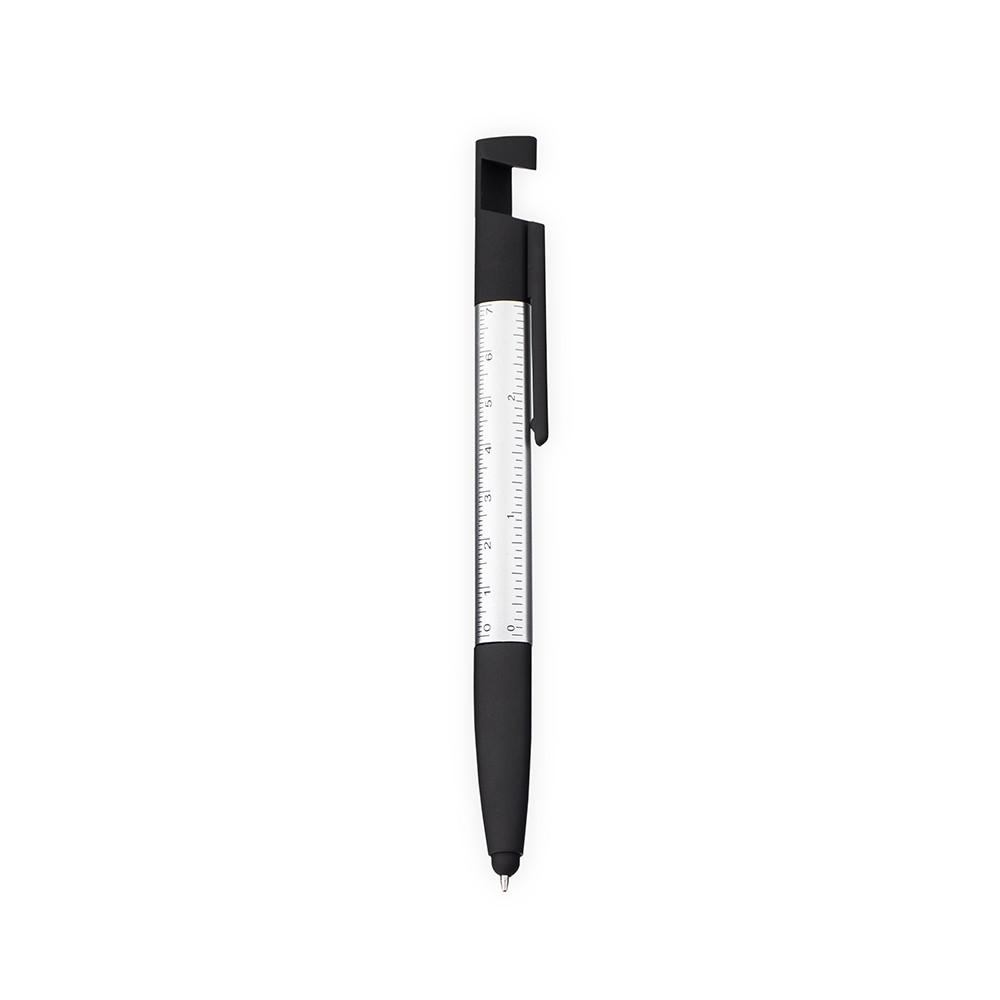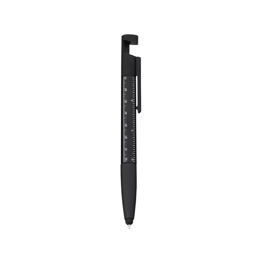 Caneta plástica triangular com ponteira emborrachada para interação em dispositivos de telas sensíveis ao toque. Possui clip com revestimento em feltro no topo, ideal para limpeza de tela, além de abertura que funciona como suporte para celular. Conta ainda com marcação de régua de 7 cm no corpo, acionamento por rotação e carga esferográfica azul de 1,0mm.
