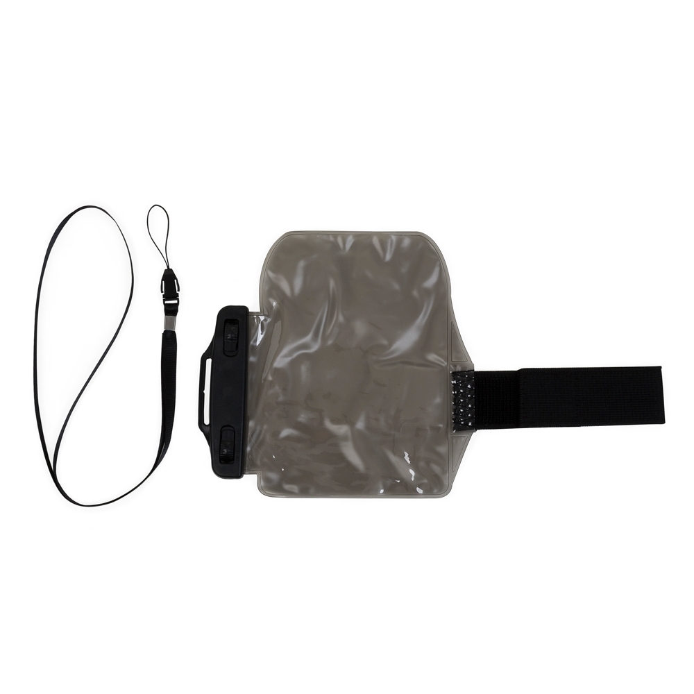 Capa braçadeira impermeável para celular. Parte frontal transparente e verso fosco, suporte plástico superior com fivelas rotatórias(basta rotacioná-las para abrir o case). Possui na lateral fita elástica com velcro para e acompanha cordão de cetim.