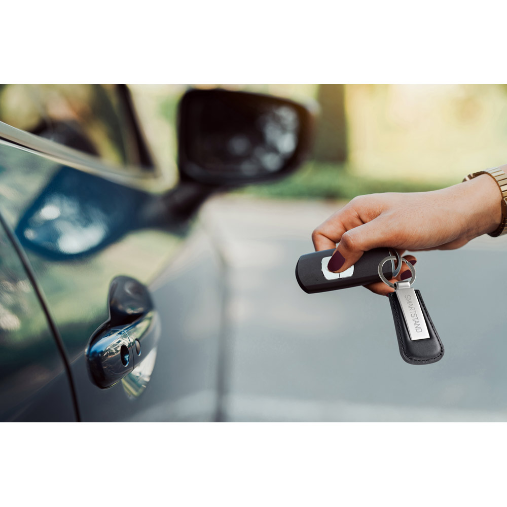 Chaveiro em c. sintético e metal. Fornecido em caixa presente de papel kraft. 38 x 76 x 9 mm