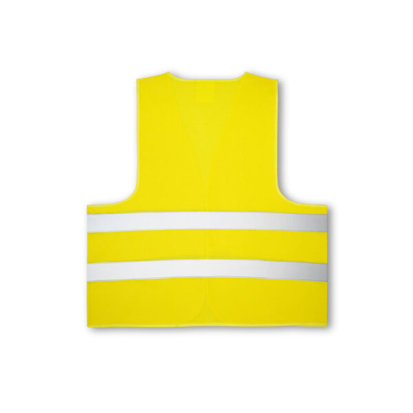 Colete de alta visibilidade em poliéster, com certificado pela norma EN ISO 20471 classe 2. Colete refletivo com 2 bandas refletoras horizontais e abertura frontal com fecho aderente. Tamanho único: 670 x 700 mm