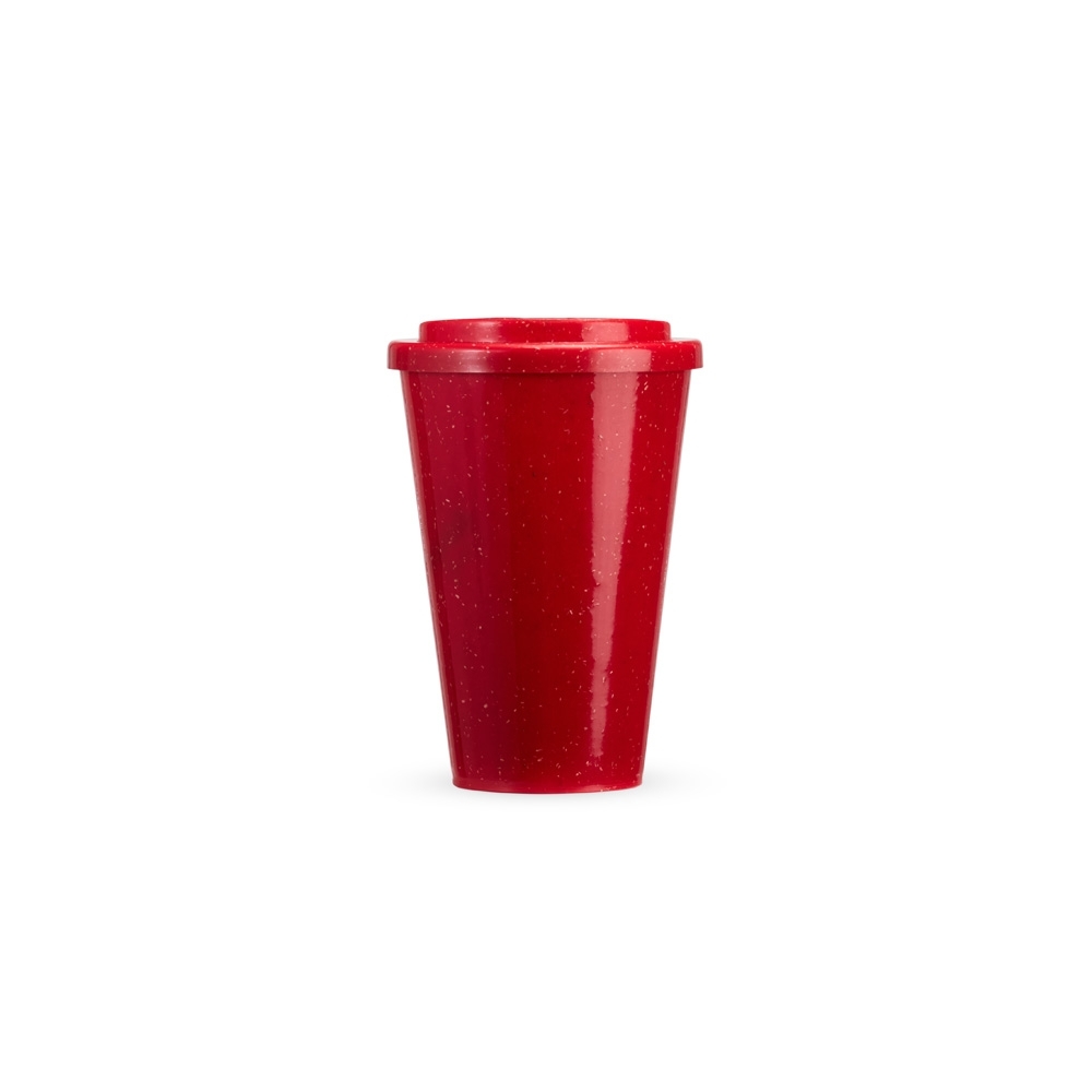Copo feito em fibra de madeira com capacidade máxima de 450ml. Possui tampa com bocal.