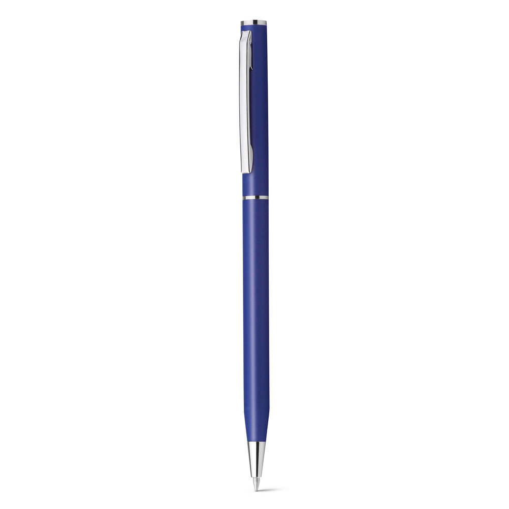 Esferográfica com mecanismo twist e clipe de metal. Escrita em azul. ø7 x 129 mm