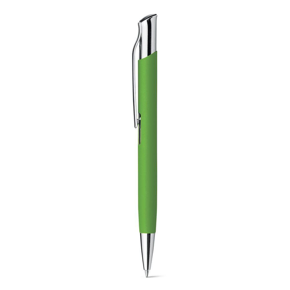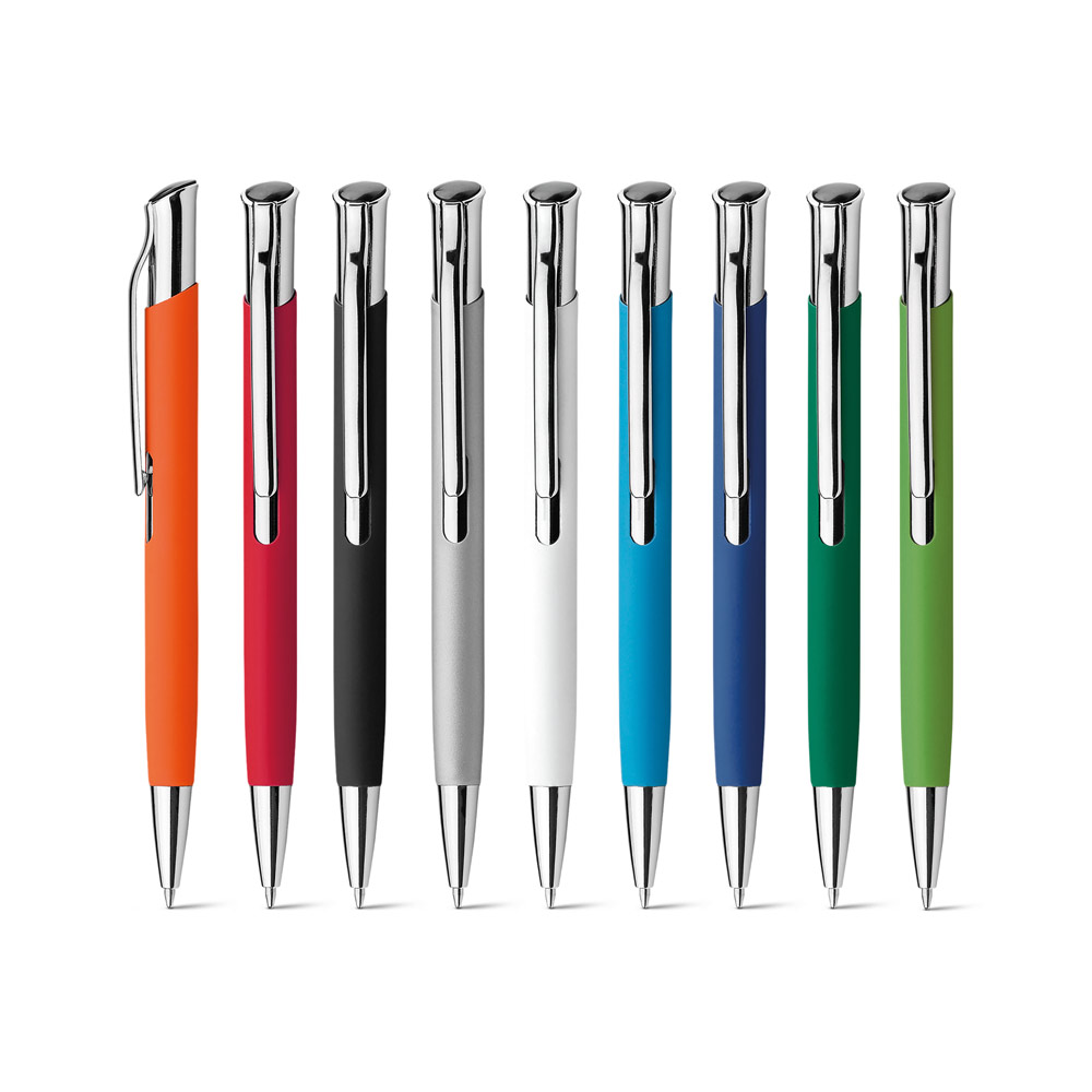 Esferográfica em alumínio com acabamento emborrachado e clipe de metal. Escrita em azul. ø10 x 137 mm