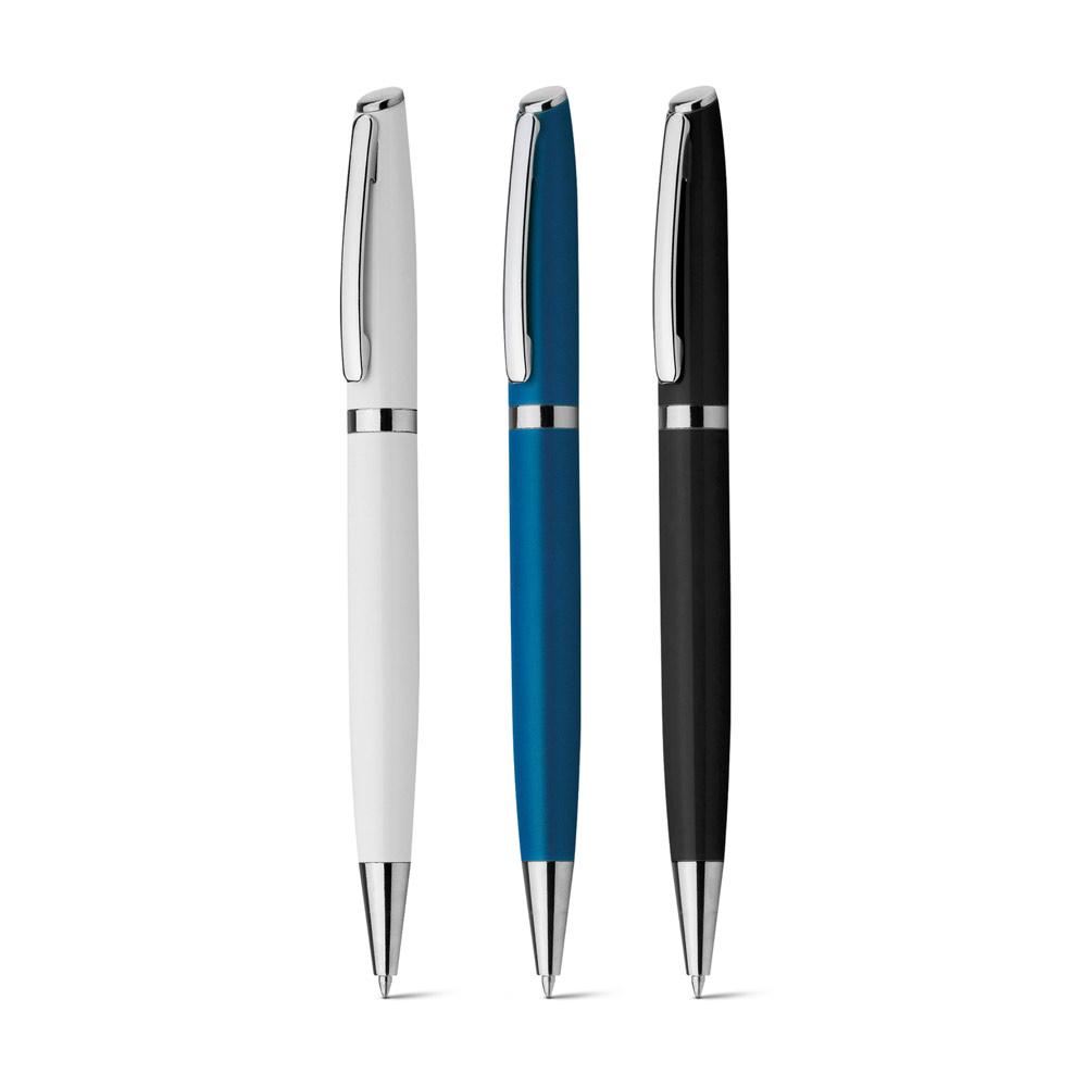 Esferográfica em alumínio com mecanismo twist e clipe. Até 1.8 km de escrita. Escrita em azul. ø11 x 140 mm