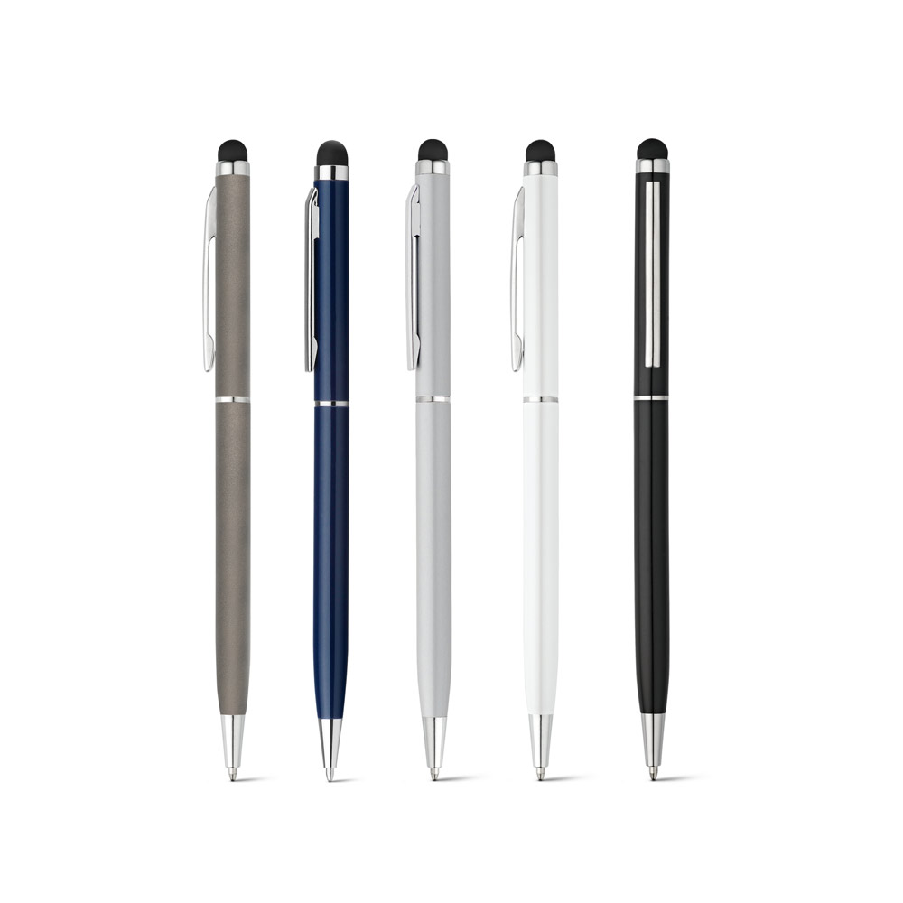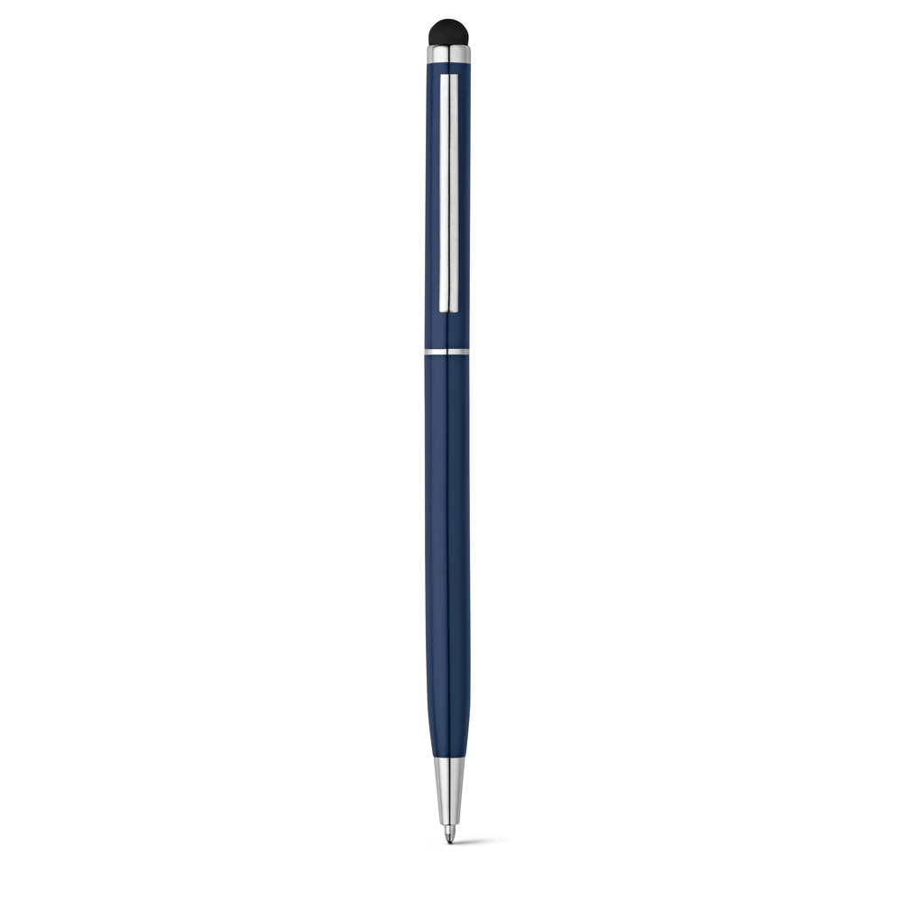 Esferográfica em alumínio com mecanismo twist, ponteira touch e clipe de metal. Escrita em azul. ø8 x 135 mm