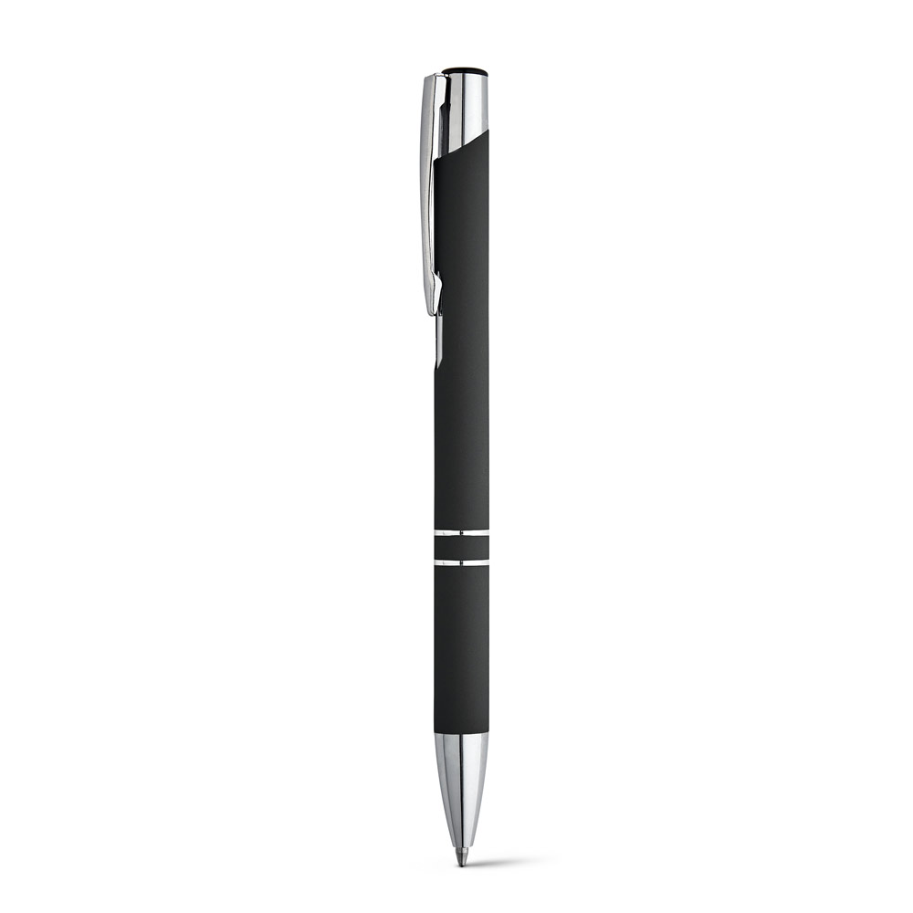 Esferográfica em alumínio com acabamento emborrachado e clipe de metal. Escrita em preto. Até 1.5 km de escrita. ø10 x 137 mm