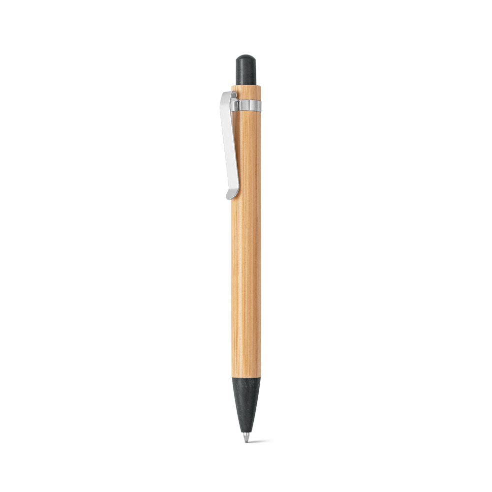 Esferográfica em bambu e clipe em metal. Os elementos coloridos são em fibra de trigo e ABS. Escrita em azul até 1.5 km. A cor e o resultado da impressão nos materiais naturais pode variar entre produtos. ø11 x 142 mm