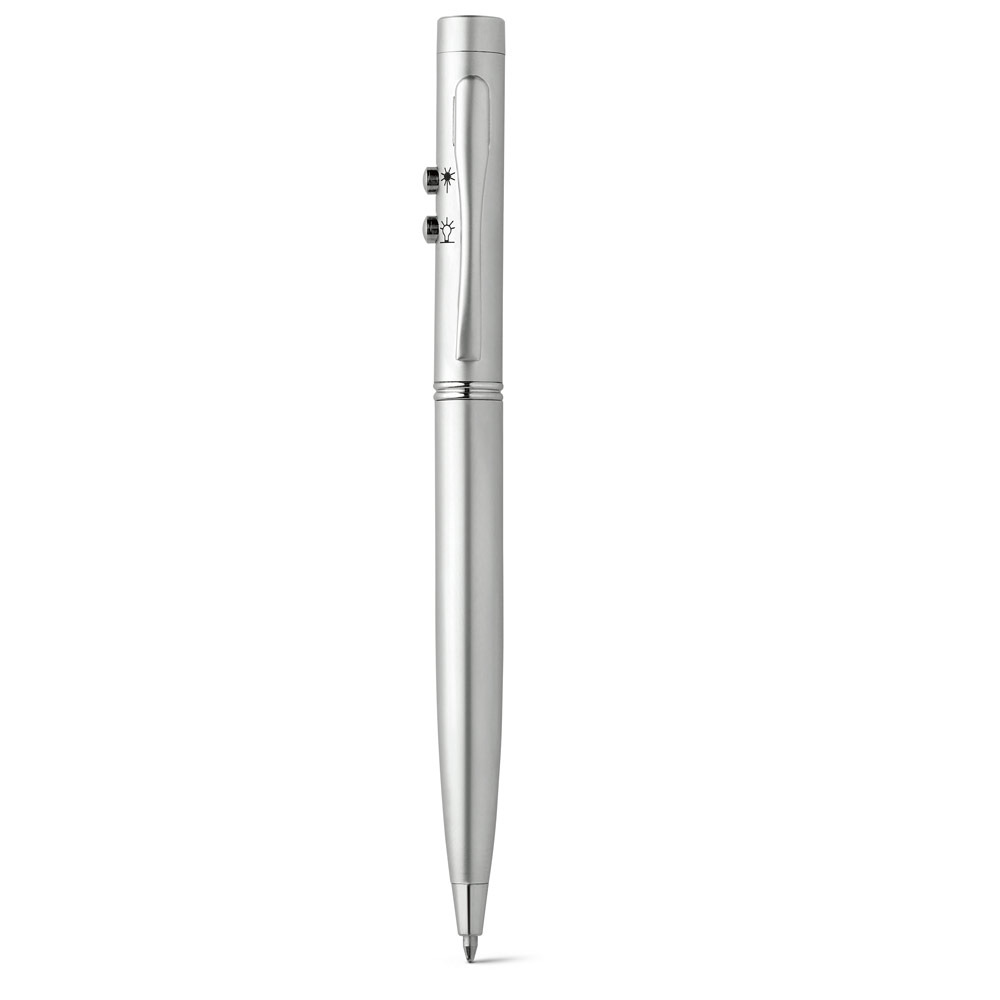 Esferográfica em metal, com ponteira laser e LED. Incluso 3 pilhas LR41. Até 1.5 km de escrita. Escrita em azul. Fornecida em estojo com forro de veludo. ø10 x 131 mm | Estojo: 170 x 50 x 20 mm