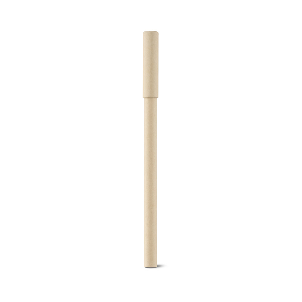 Esferográfica em papel kraft, com interior proveniente do reaproveitamento de papel de jornal, e tampa em papel kraft. Escrita em azul. A cor e o resultado da impressão nos materiais naturais pode variar entre produtos. ø6 x 145 mm
