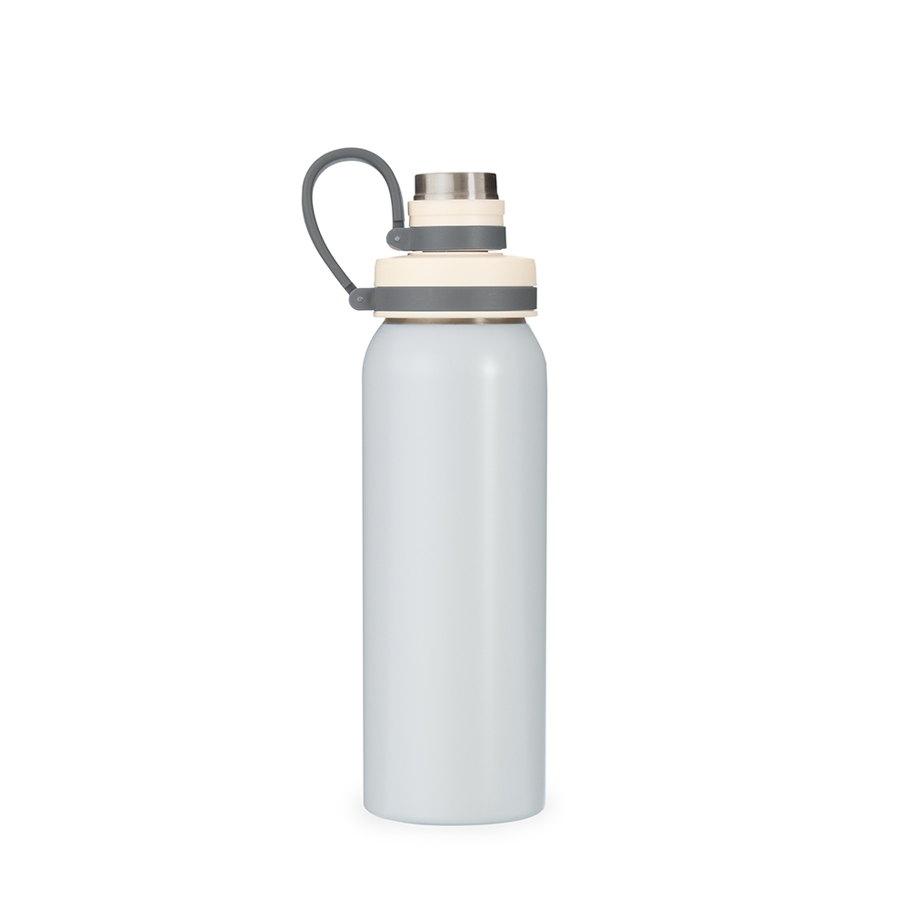 Garrafa em inox com capacidade máxima de 800ml. Possui tampa plástica com protetor rosqueável para o bocal e alça fixa em silicone.