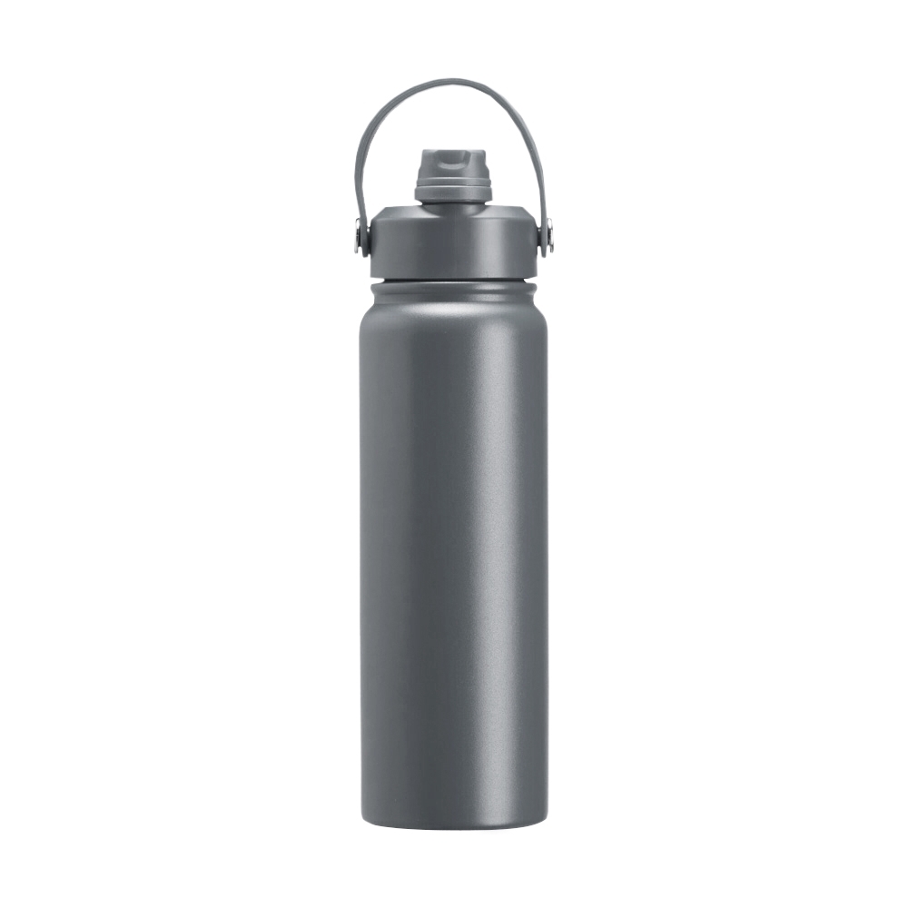 Garrafa térmica em inox com pintura eletrostática e capacidade máxima de 800ml. Possui estrutura interna de parede dupla em inox 304 e vedação a vácuo que permite a manutenção de temperatura de líquidos por mais tempo. Possui tampa rosqueável feita em plástico com proteção para o bocal, bico flip, canudo interno removível e alça fixa maleável para transporte.