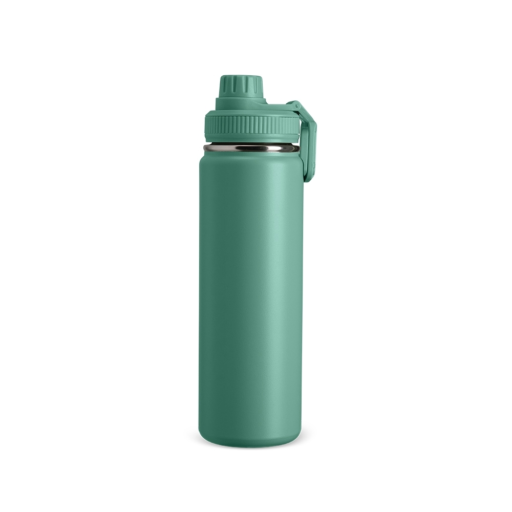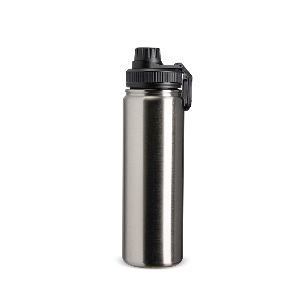 Garrafa térmica feita em inox com pintura eletrostática e capacidade de até 750ml. Possui estrutura em parede dupla e isolamento a vácuo, o que permite manter a temperatura de líquidos conservada por mais tempo. Conta ainda com tampa rosqueável em plástico, protetor para o bocal e alça retangular para transporte.