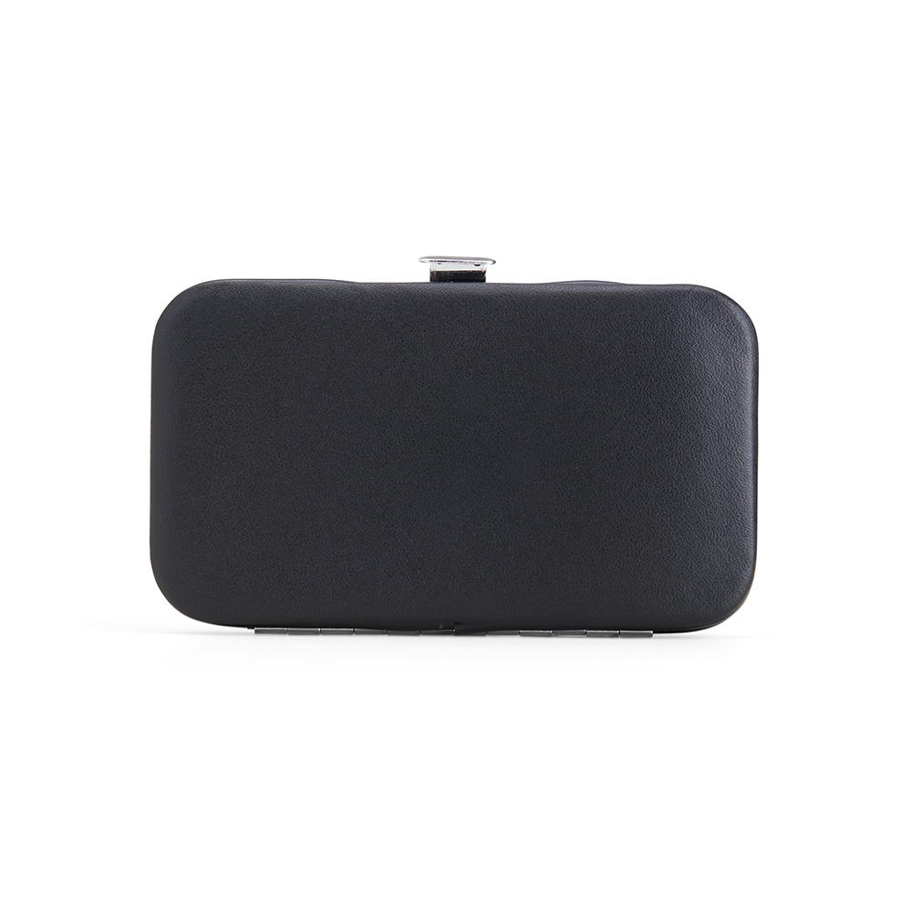 Kit manicure 7 peças em estojo de couro sintético. Possui: dois cortadores de unhas, tesoura, lixa, pinça, empurrador de cutícula e espátula para ouvido. Parte interna de TNT com suporte de couro sintético para fixar as peças. Para abrir o estojo basta apertar o botão central.