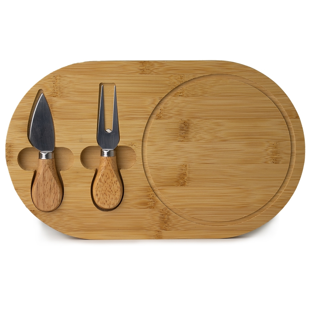 Kit queijo 3 peças, contém: tábua de bambu com canaleta, faca com ponta e garfo. Tábua com imã para encaixe e fixação dos utensílios.