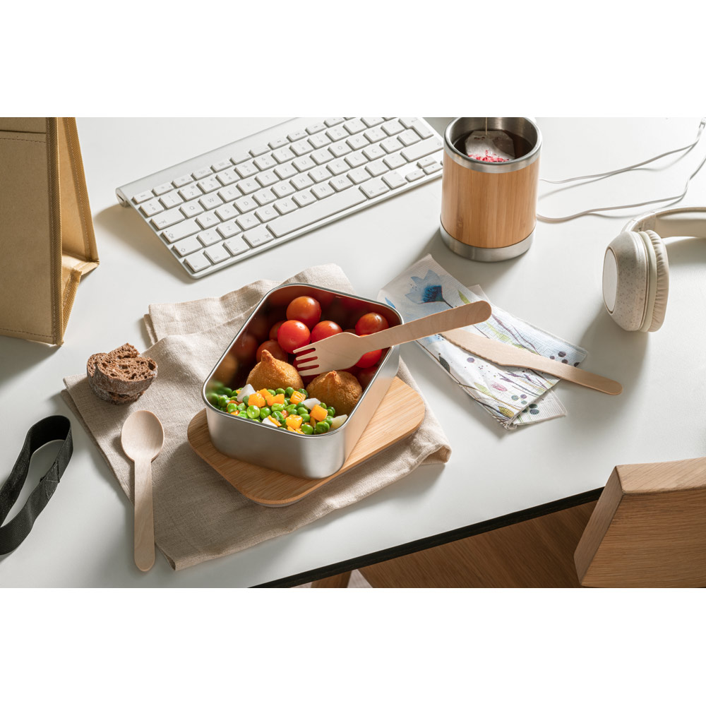 Marmita em aço inox e tampa em bambu com banda elástica para um transporte mais seguro. Capacidade até 800 mL. Fornecida caixa presente em papel kraft reciclado. Certificação EU Food Grade. A cor e o resultado da impressão nos materiais naturais pode variar entre produtos. 165 x 115 x 52 mm
