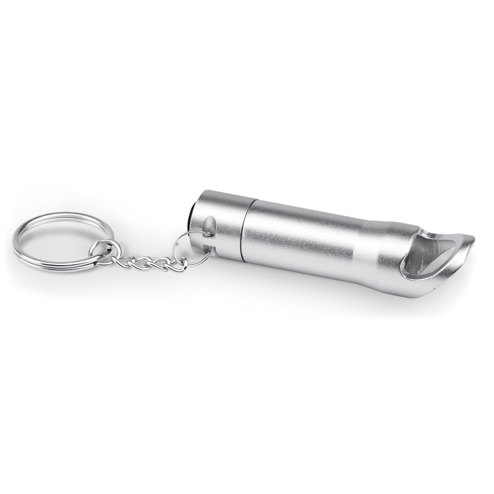 Lanterna em metal com 3 LEDs, abridor de garrafas e chaveiro. Incluso 3 pilhas LR44. ø18 x 72 mm