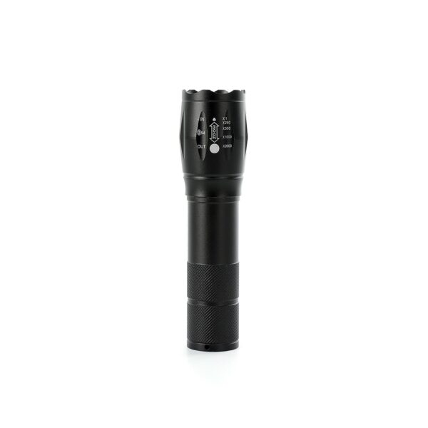 Lanterna led recarregável com zoom de regulagem e três estágios de iluminação, material metálico com USB acoplado para carregamento. Acompanha cordão de nylon.