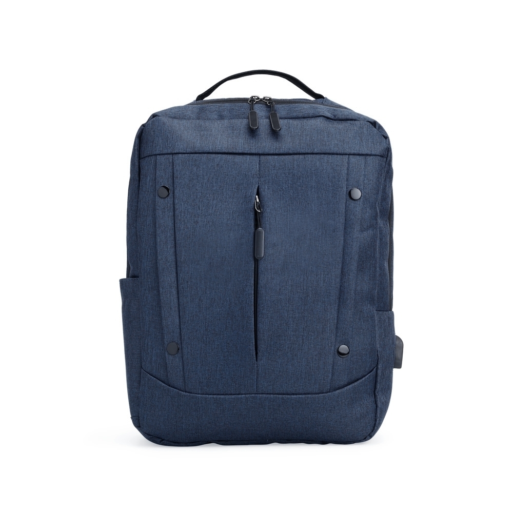 Mochila de nylon 21 Litros com dois compartimentos, sendo o principal com bolso para notebook 15,6. Com divisórias internas para acessórios, a mochila possui bolso lateral, suporte externo USB e alça para engate em malas de viagem.