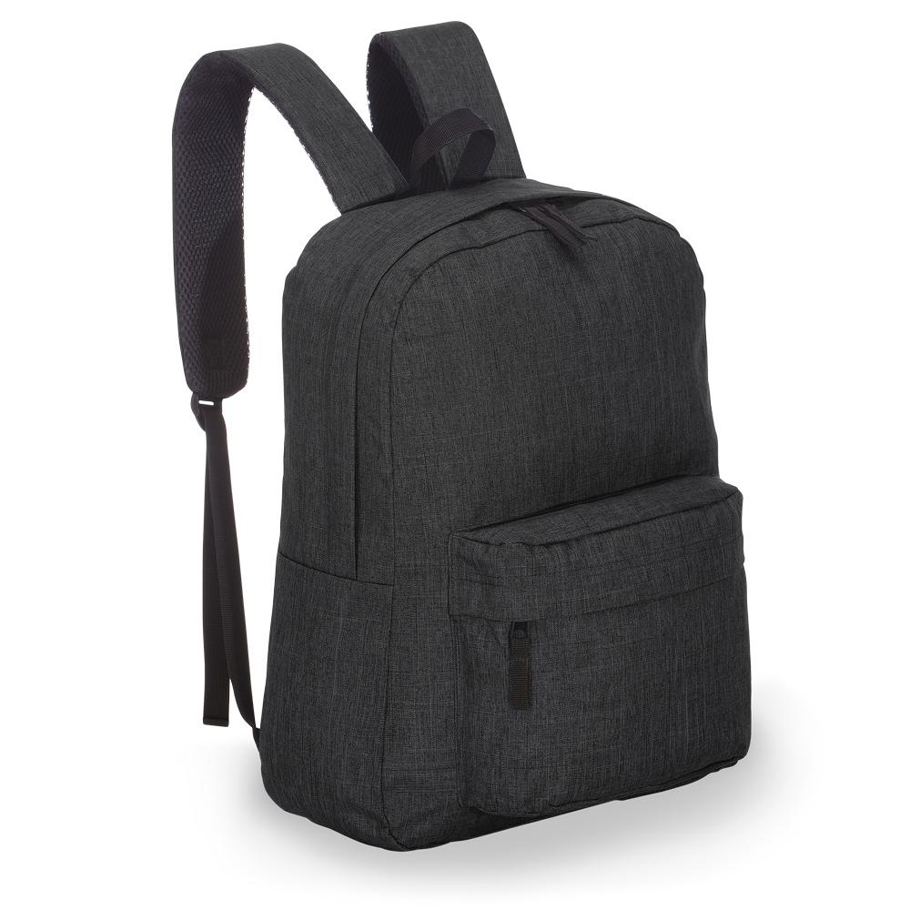 Mochila de poliéster com compartimento principal superior e compartimento frontal, possui zíperes com pegadores de nylon, alça de mão em nylon e alças ajustáveis para as costas com revestimento espumado.