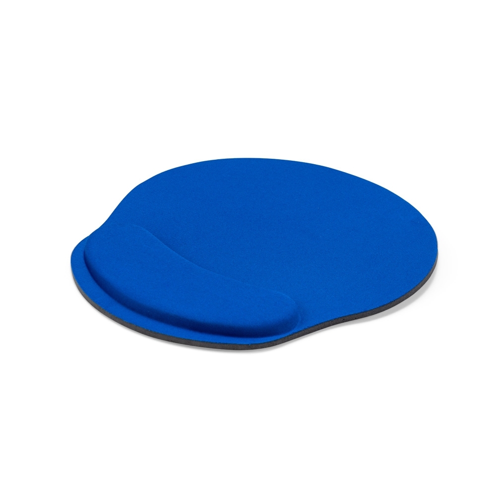 Mouse pad ergonômico com apoio em espuma para o punho, superfície em tecido sintético e base em EVA.