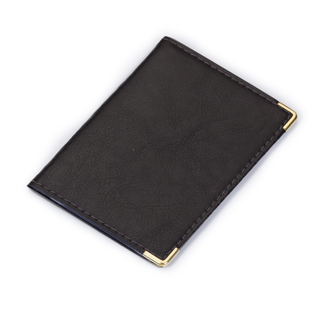 Porta-documento em couro sintético com cantoneira dourada, possui 4 divisórias plásticas grande e duas divisórias pequenas.