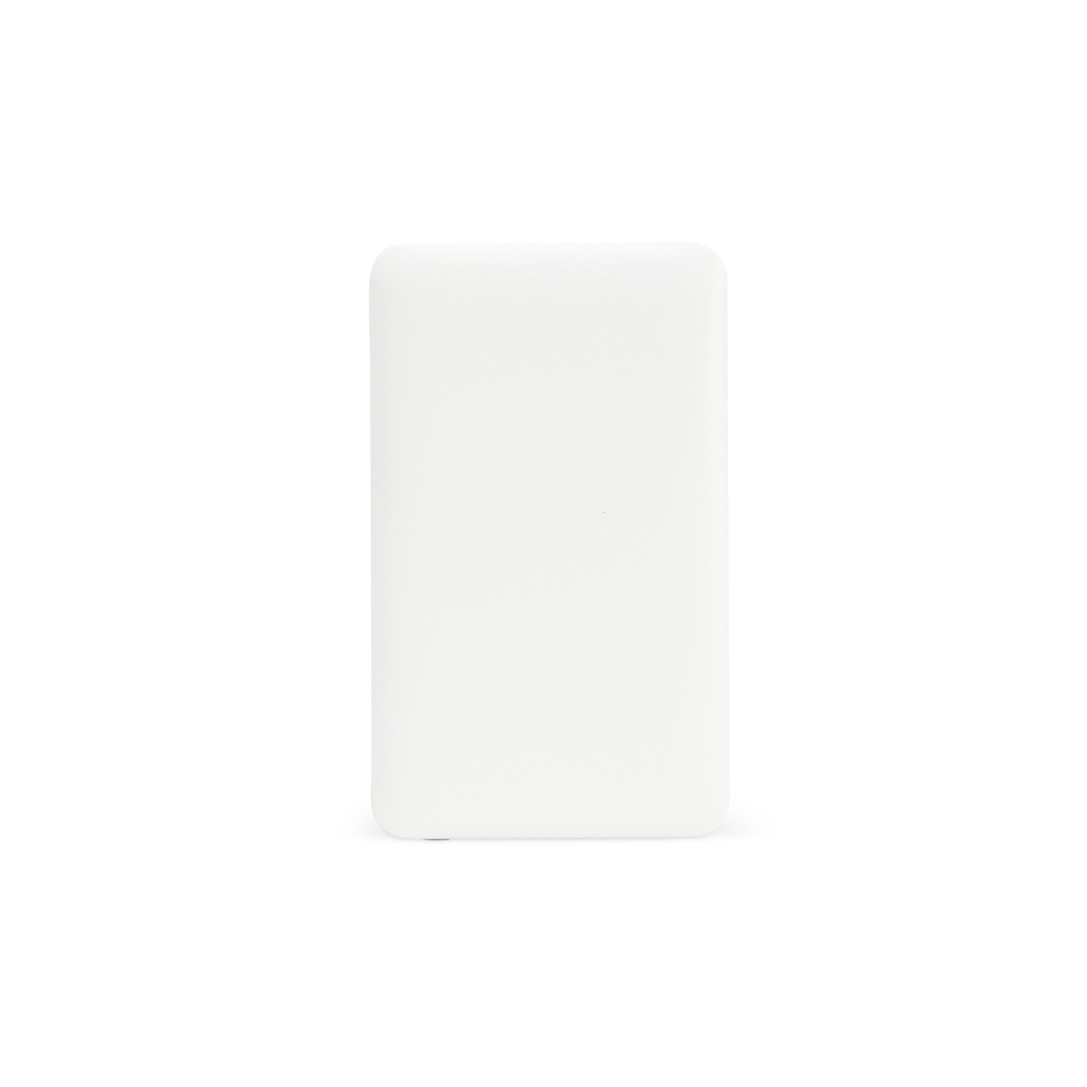 Power bank plástico de 5.000mAh com indicadores led de bateria e cabos acoplados: Lightning e V8. Acompanha cabo USB-V8 e adaptador Tipo-C.