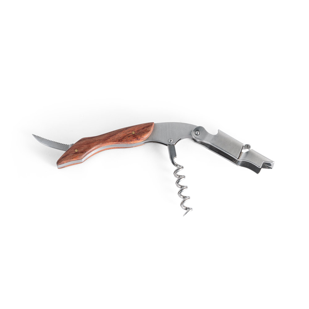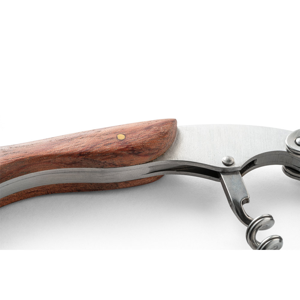 Saca rolhas em madeira e aço inox. Com sistema de mola para extração em duas fases. Com canivete de escanção. Fornecido em caixa de oferta em papel kraft. A cor e o resultado da impressão nos materiais naturais pode variar entre produtos. 120 x 28 x 13 mm
