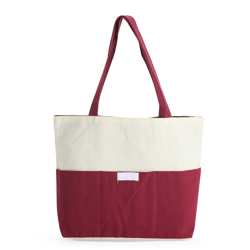 Sacola confeccionada em lona 356g/m² com revestimento interno em poliéster, bolso frontal aberto e duas alças com costura interna.